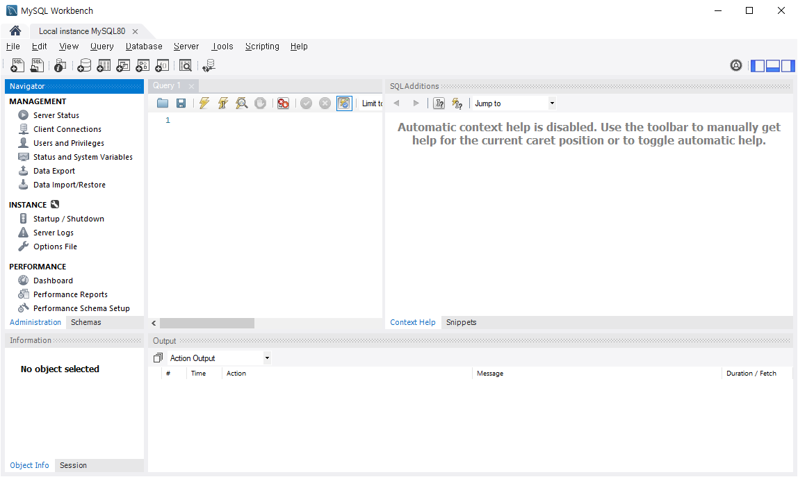 => 초기 생성된 Local instance MySQL80을 마우스 우클릭 후 Open Connection을 클릭