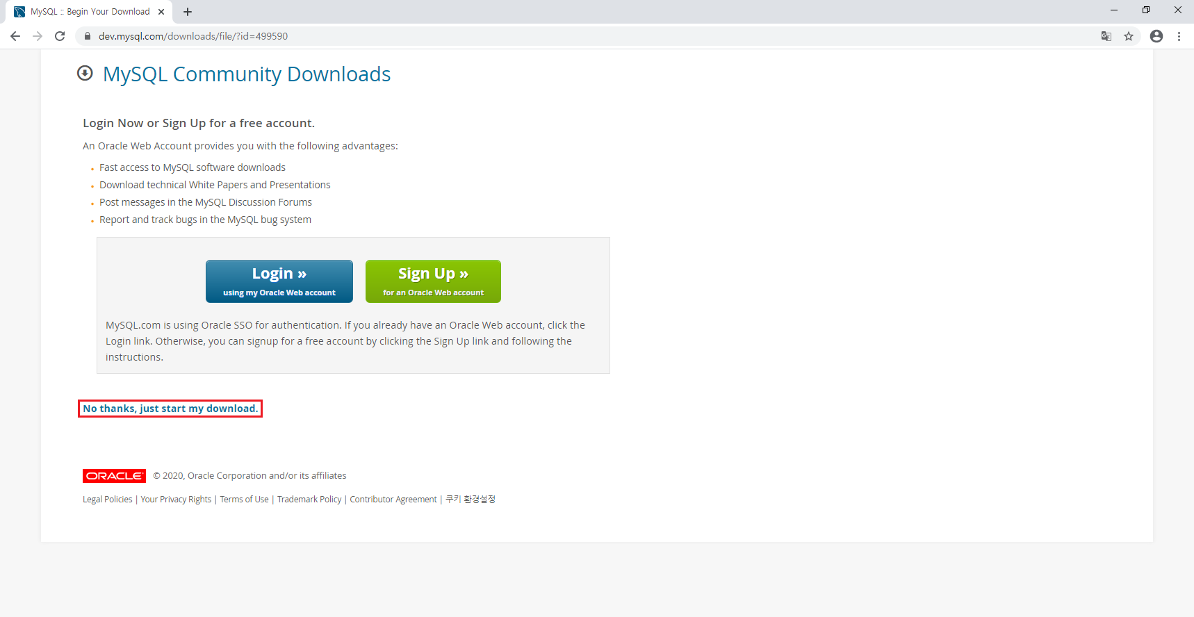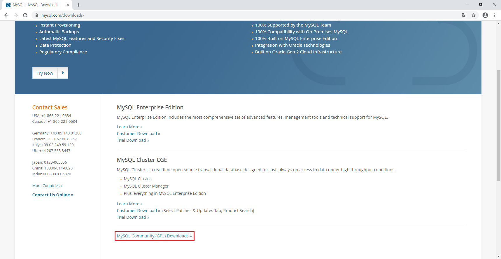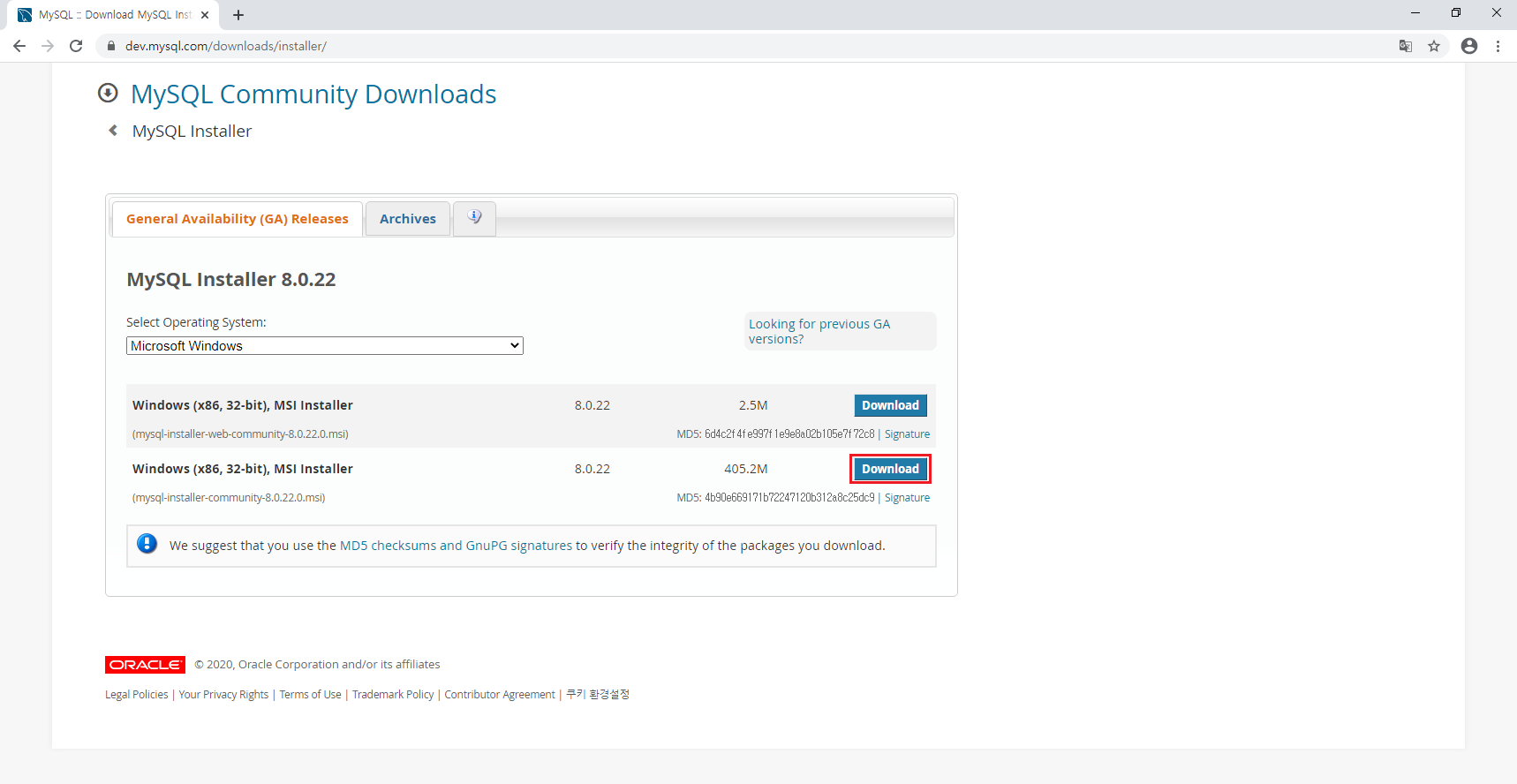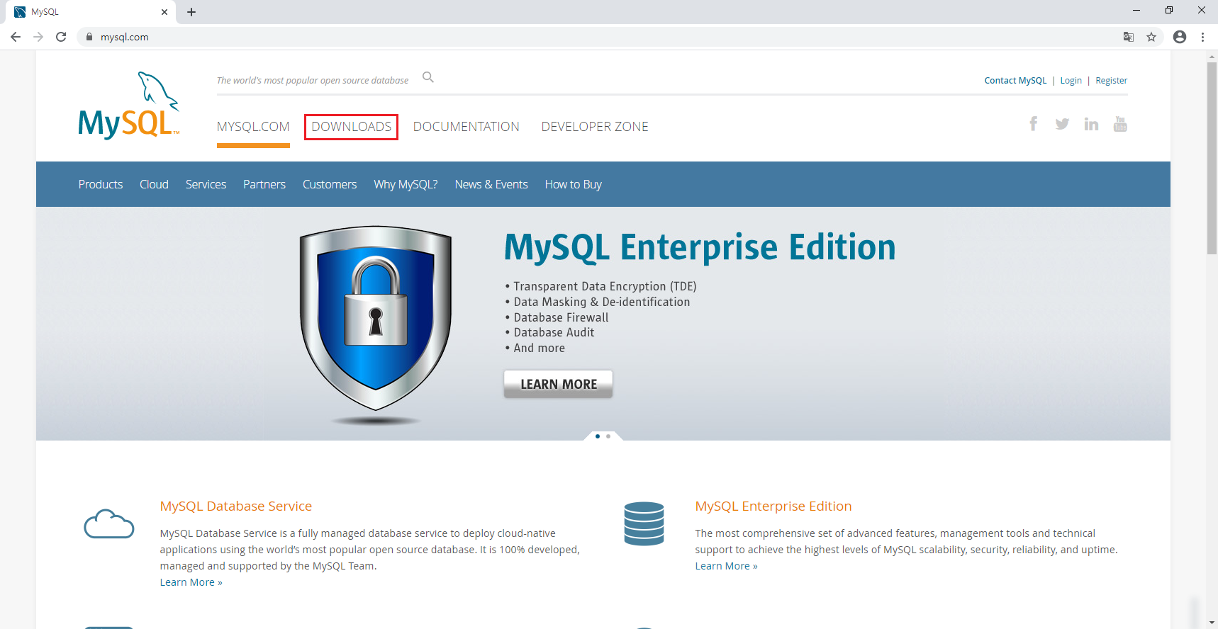 => MySQL 홈페이지에 접속하여 상단의 DOWNLOADS 메뉴 클릭