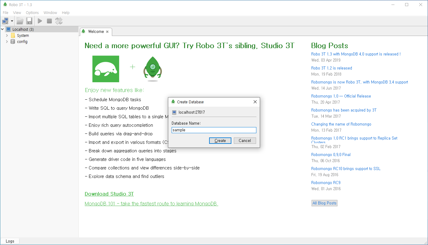 => 생성하고자 하는 Database Name(ex. sample)을 입력 후 Create 버튼을 클릭하면 새로운 Database가 생성됩니다.