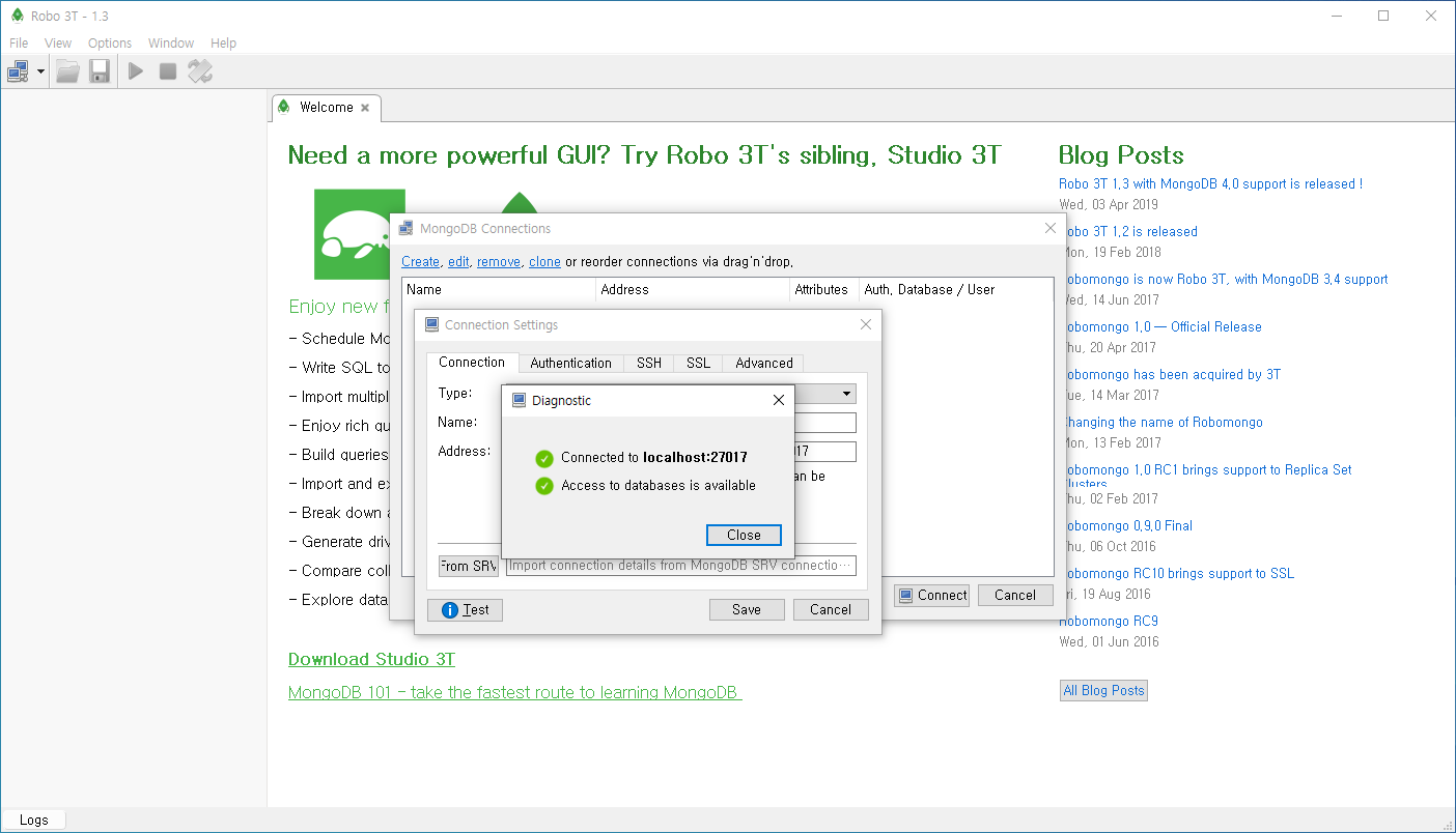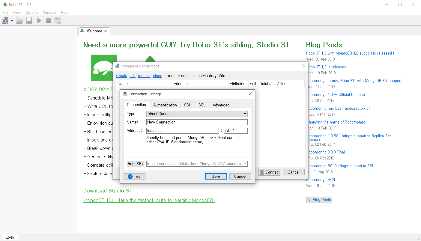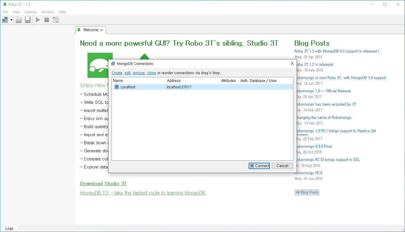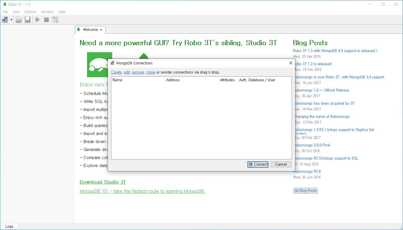 => 설치 완료 후 Robo 3T 첫 실행화면 입니다.