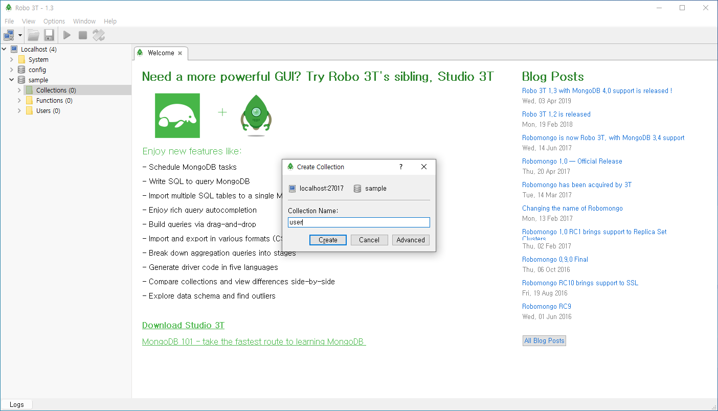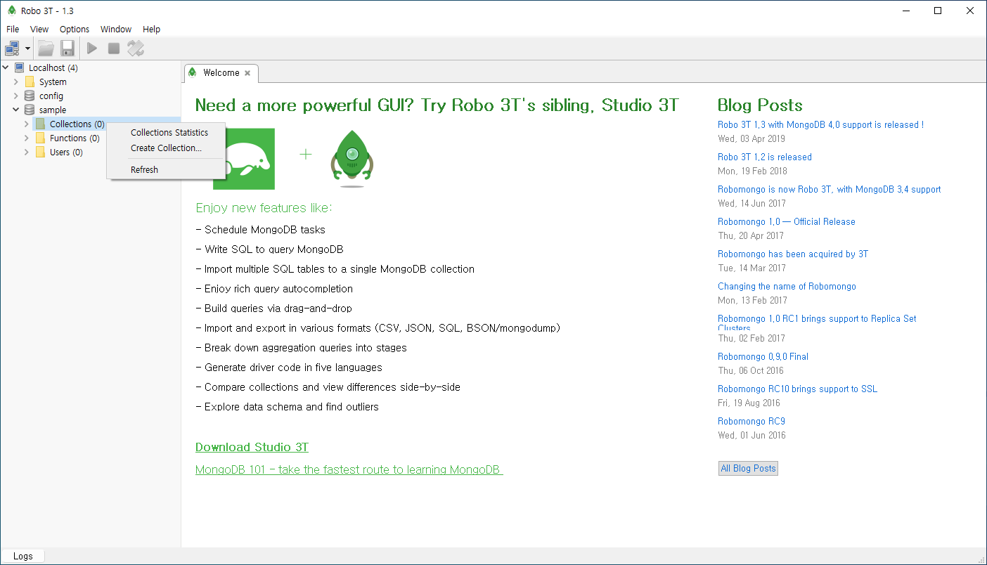 => sample Database 하위의 Collections위에 마우스 우클릭 후 Create Collection 클릭하여 새로운 Collection을 생성합니다.