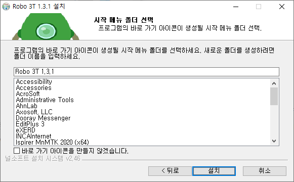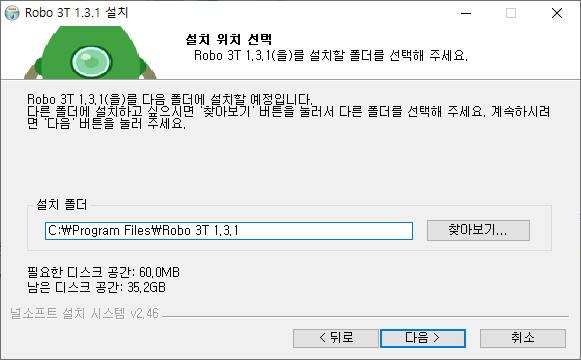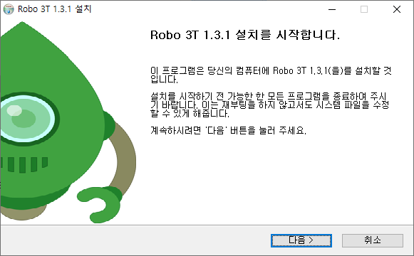 => 다른 폴더에 설치하고 싶은 경우 설치 폴더를 변경(ex. C:\Dev\Robo 3T 1.3.1) 후 다음 버튼을 클릭합니다.