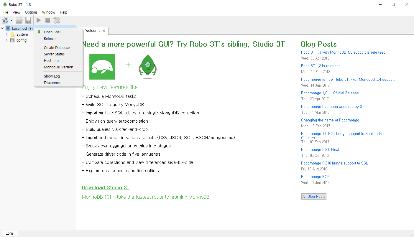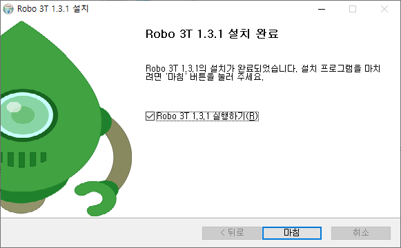 Robo 3T 1.3.1 실행하기에 체크 후 마침 버튼을 클릭하면 바로 Robo 3T가 실행됩니다.