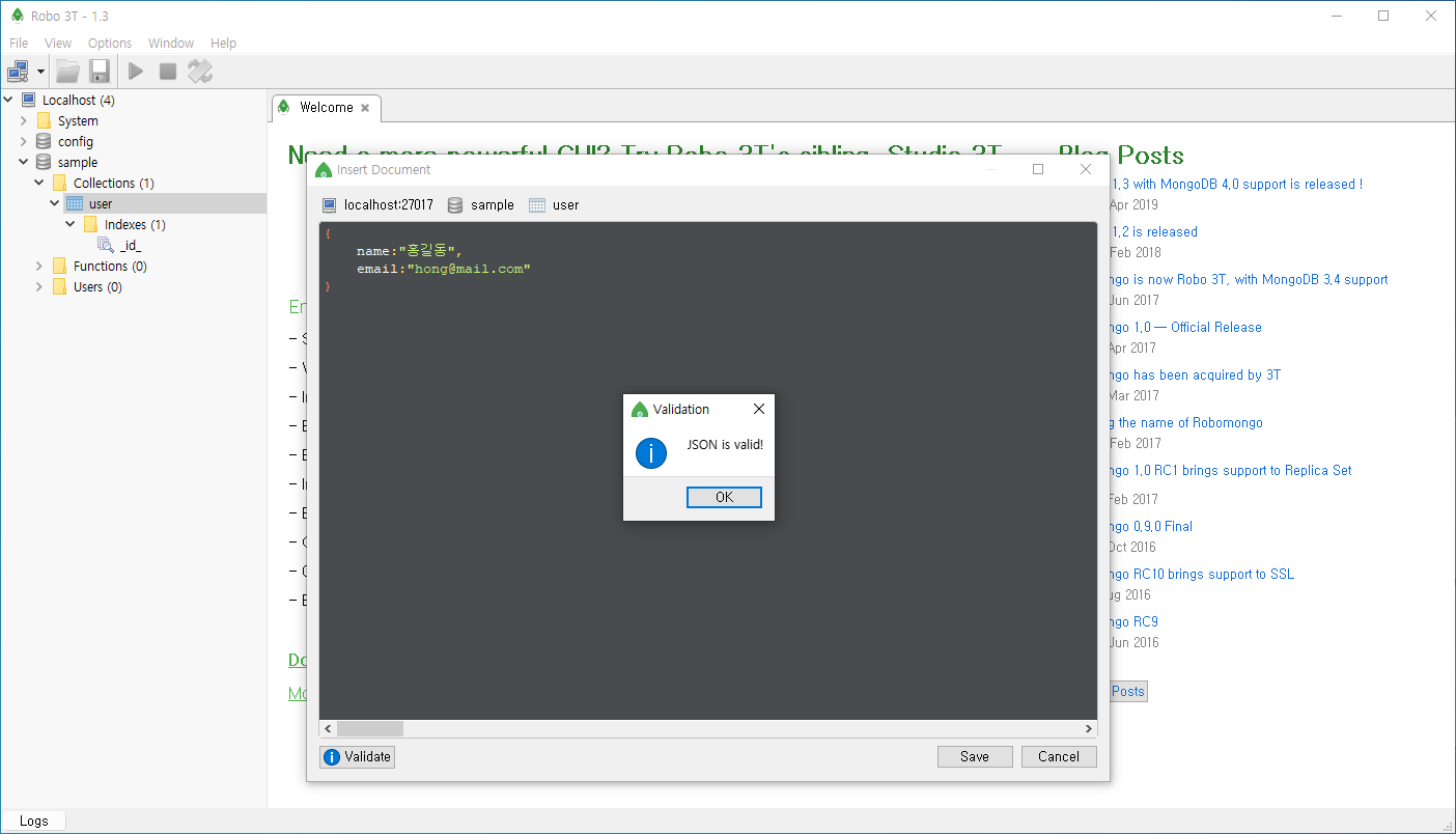 => Insert 하고자 하는 데이터가 JSON 형식에 맞게 유효하게 입력되었는지 Validate 버튼을 클릭하여 확인합니다.