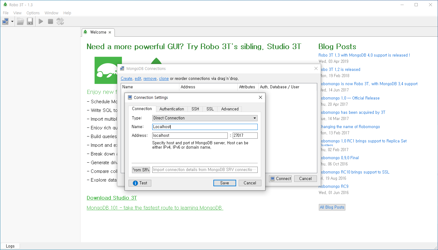 => Type은 Direct Connection으로 선택, Name에는 접속 정보 이름을 입력, Address에는 접속할 MongoDB Server 정보를 입력합니다.