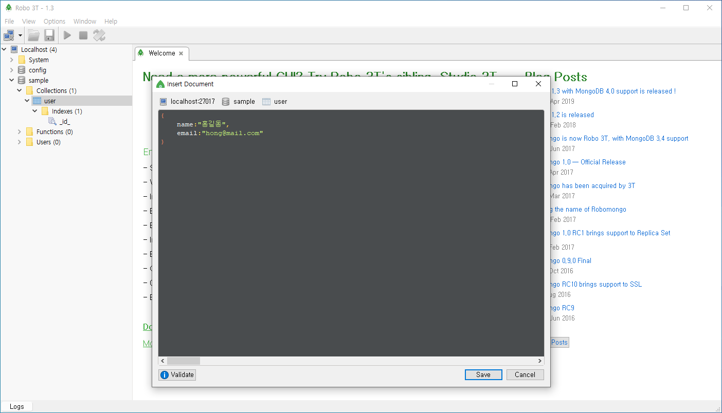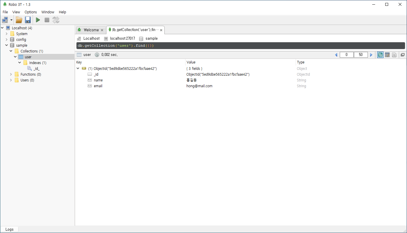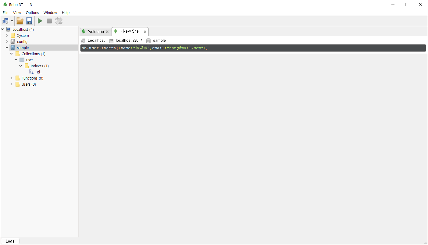 db.user.insert({name:"홍길동",email:"hong@mail.com"})